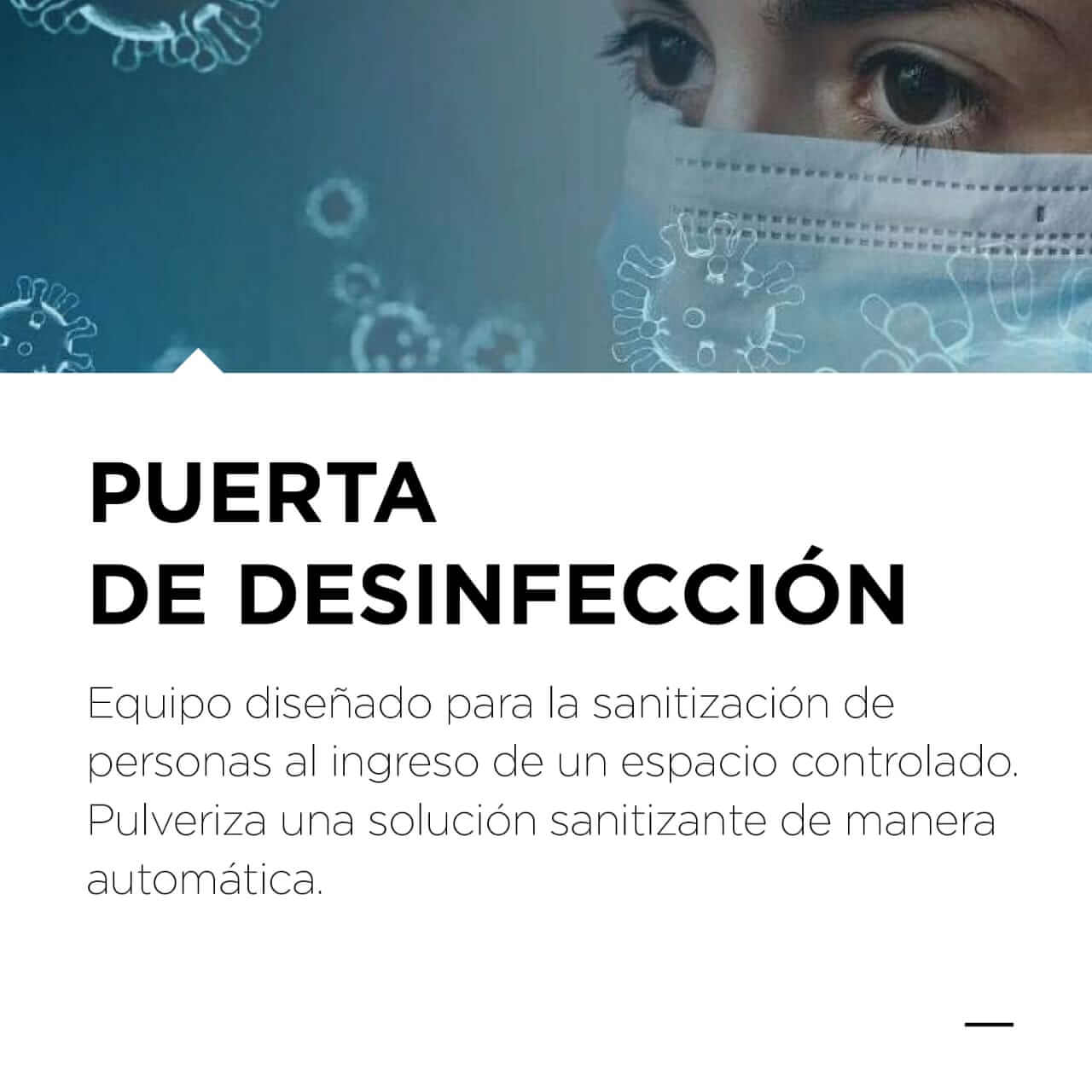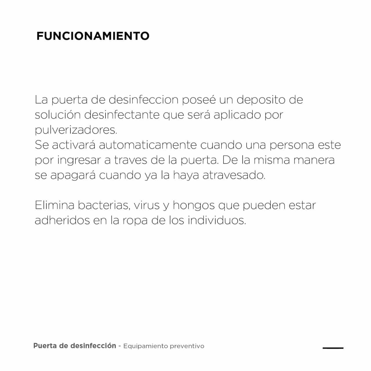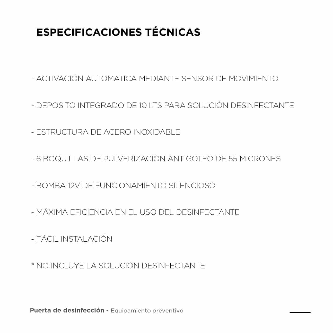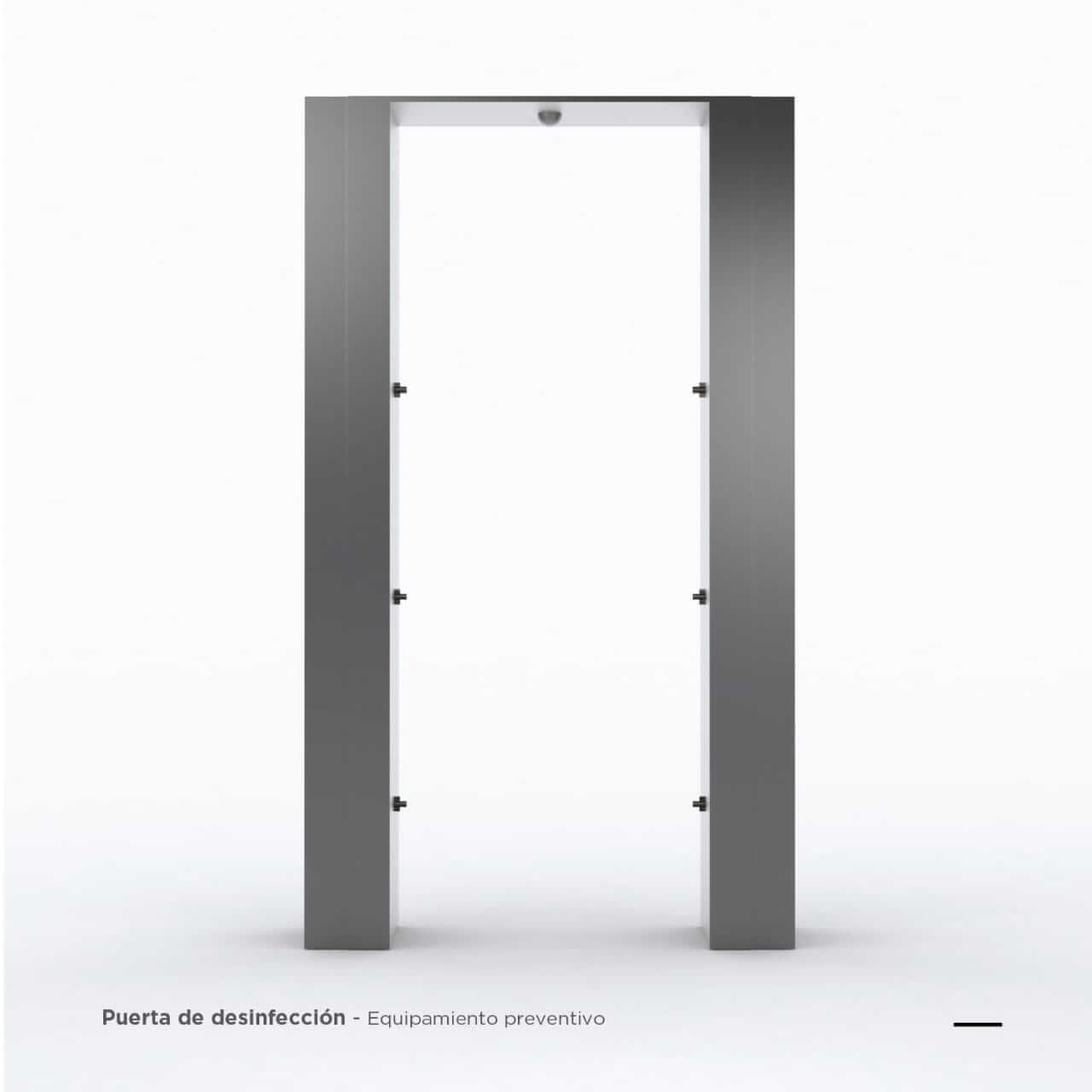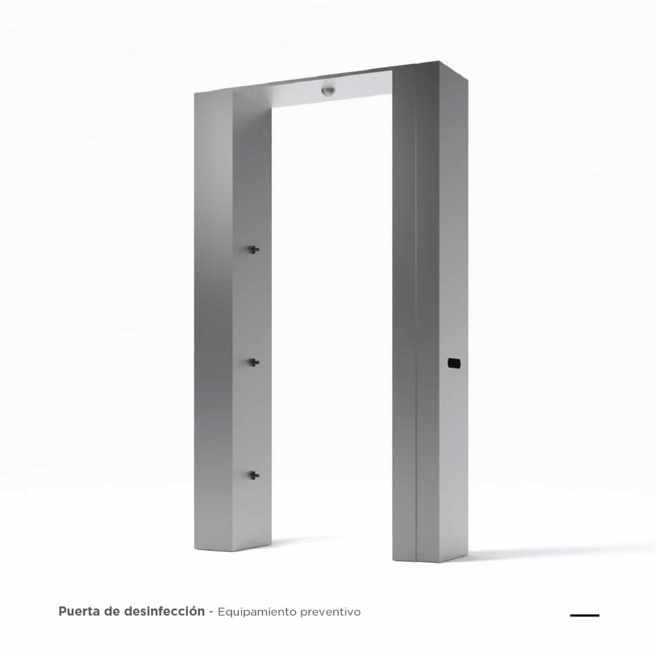 Puerta de desinfeccion: Equipo diseñado para la sanitizacion de personas al ingreso de un espacio controlado. Pulveriza una solucion sanitizante de manera automatica. Con la correcta solucion desinfectante sirve para eliminar el COVID-19 y el Conovirus que pueda portar exteriormente una persona.Especificaciones Tecnicas:Activacion automatica mediante sensor de movimientoDeposito integrado de 10 litros para solucion desinfectanteEstructura de Acero InoxidableBoquillas de Pulverizacion antigoteo de 55 micronesBomba 12V de funcionamiento silencioso* No incluye solucion desinfectanteFuncionamiento:La puerta de desinfeccion posee un deposito de solucion desinfectante que sera aplicado por pulverizadores. Se activara automaticamente cuando una persona este por ingresar a traves de la puerta. De la misma manera se apagara cuando ya la haya atravesado.Elimina bacterias, virus y hongos que pueden estar adheridos en la ropa de los individuos.ATENCION: Si la persona tiene el virus dentro de su organismo, esto no lo eliminara y sera propensa de contagiar, por eso siempre hay que utilizar las normas de seguridad correspondientes a cada persona.